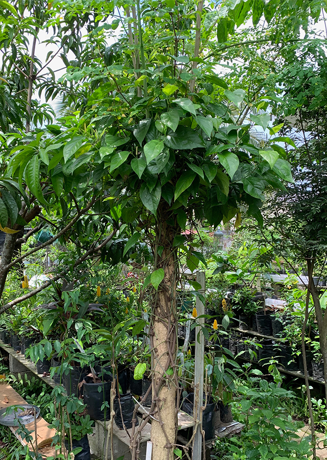Termasuk tumbuhan menahun, batang percabangan liar, tumbuh memanjat, melilit, atau melata dengan akar lekatnya, panjangnya dapat mencapai 10 meter. Percabangan dimulai dari pangkalnya yang keras dan menyerupai kayu. Daun tunggal, bertangkai, bentuknya bulat telur sampai lonjong, pangkal membulat, ujung runcing, tepi rata, pertulangan menyirip, permukaan atas licin, permukaan bawah berbintik-bintik, berwarna hijau.