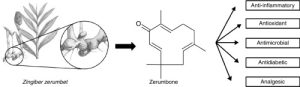 Rimpang : minyak atsiri yang tersusun dari a-kurkumen, bisabolen, zingiberen, kariofilen, seskuifelandren, zerumbon, limonen, kamfer, di samping itu zat pedas gingerol, sogaol, zingeron, paradol, heksahidrokurkumin, dihidrogingerol.