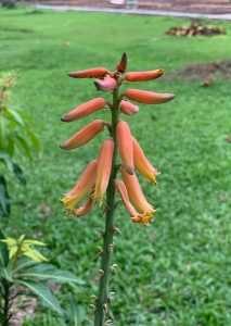 - Bunga bertangkai yang panjangnya 60-90 cm, berwarna kuning kemerahan (jingga), keluar dari ketiak daun.