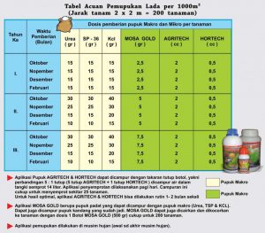 Jika sudah saatnya pembuahan II (buah bagian atas) dilakukan pemupukan ke dua dengan dosis NPK ± 0,5 kg/ batang + MOSA GOLD 2-3 sdm / batang (lihat tabel).