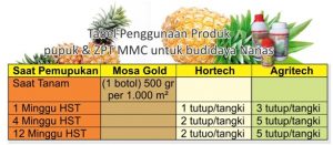 Lahan 1000 m2 diperlukan Mosa Gold 500 gr/ 1 botol, Agritech 500 cc/1 botol, Hortech 100 cc/1 botol.