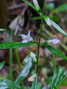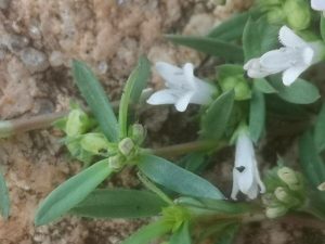 Rumput mutiara tumbuh rindang berserak, tinggi 15-50 cm, tumbuh subur pada tanah lembap di sisi jalan, pinggir selokan, mempunyai banyak percabangan. Batang bersegi, daun berhadapan bersilang, tangkal daun pendek / hampir duduk, panjang daun 2-5 cm, ujung runcing, tulang daun satu di tengah.